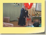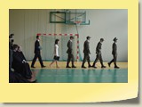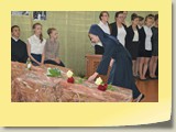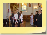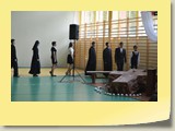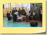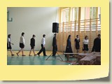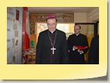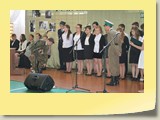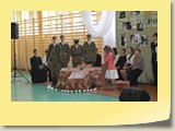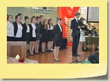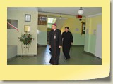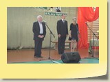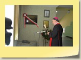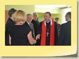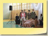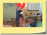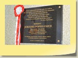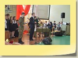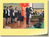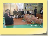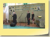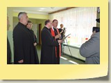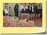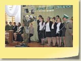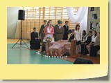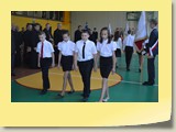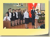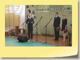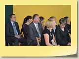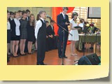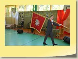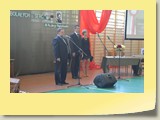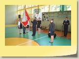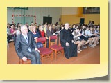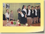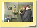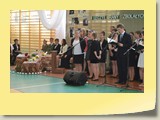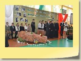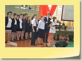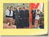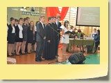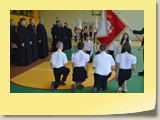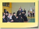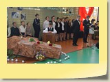 Po zakończonej Mszy Św. uczestnicy przemieścili się do szkoły, gdzie odbyła się druga część spotkania. Cała społeczność szkolna oraz zaproszeni goście uczestniczyli w celebrze przekazania sztandaru szkole przez rodziców oraz ślubowaniu dzieci i młodzieży, w którym zobowiązały się iść drogą wyznaczoną przez wartości, za które oddał życie nasz patron. Ważnym momentem uroczystości było poświęcenie tablicy pamiątkowej, umieszczonej w kąciku Patrona w korytarzu szkolnym. Aktu dokonał ks. biskup. Specjalnie zamontowany na sali telebim umożliwił pozostałym gościom obejrzenie tej wyjątkowej chwili na ekranie.